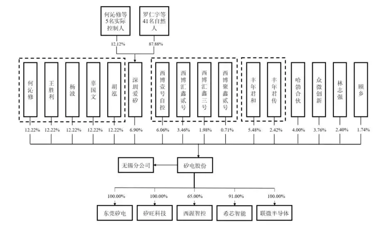 至矽电股份IPO,何沁修、王胜利、杨波、辜国文、胡泓5位创始人通过直接和间接持股合计控制公司67.99%的表决权实现对公司的控制,五人一起为公司控股股东、实际控制人。